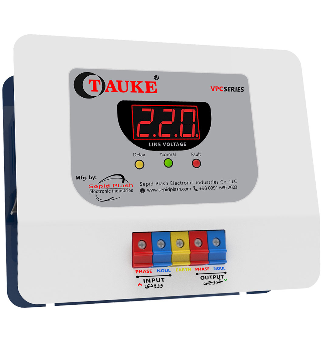 ستگاه محافظ ولتاژ تااوکه دارای ابعاد 70 × 160 × 200 سانتیمتر و وزن 1200 گرم است. ساختار بدنهی این محصول از فلز مقاوم بوده که در برابر ضربه مقاوم است. خوب است بدانید کار اصلی دستگاه ولتاژ، جلوگیری از آسیب دیدن دستگاههای برقی در اثر افزایش یا کاهش بیش از حد ولتاژ بوده که در نهایت در اثر استفاده نکردن از محافظها برد دستگاهها دچار آسیب میشود. روی این دستگاه چراغ LED برای نمایش وضعیت دستگاه وجود دارد که نمایشگر روی آن به صورت دیجیتال ولتاژ را نشان میدهد. حداقل ولتاژ این دستگاه 170 ولت بوده و این به این منظور بوده که اگر ولتاژ کمتر از 170 ولت باشد، جریان قطع میشود. این دستگاه مجهز به کلید حذف زمان تاخیر برای برقراری هرچه سریعتر جریان برق و قابلیت تنظیم ولتاژ جریان بالای قطع در سه حالت 245،255 و 265 ولت است.
